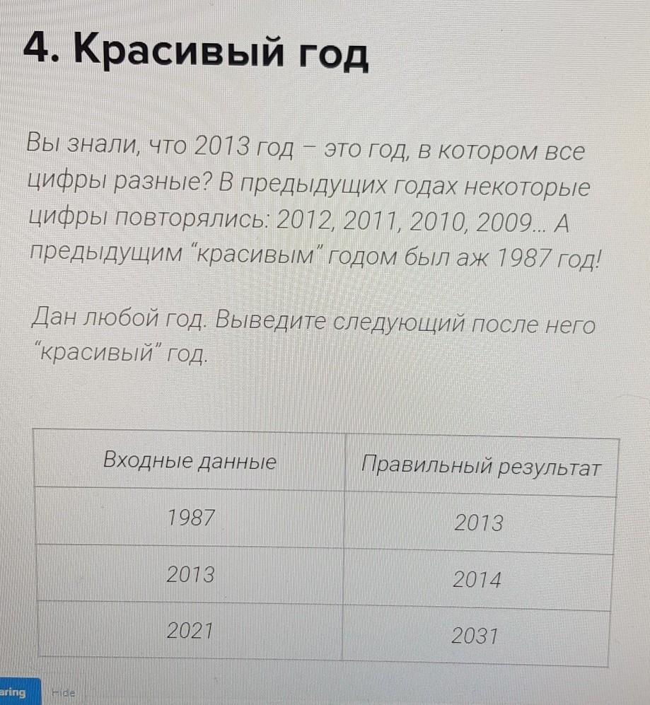 Вы знали, что 2018 год — это год, в котором все цифры разные? В предыдущих годах некоторые цифры повторялись, 2012, 2011, 2010 2009... А предыдущим красивым годом был аж 1987 год! Дан любой год. Выведите следующий лосле него "красивый" год.