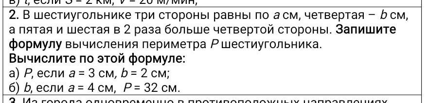 2. В шестиугольнике три стороны равны по а см, четвертая – b см, а пятая и шестая в 2 раза больше четвертой стороны. Запишите формулу вычисления периметра P шестиугольника. Вычислите по этой формуле: а) P, если а = 3 см, b = 2 см; б) b, если а = 4 см, Р= 32 см.
