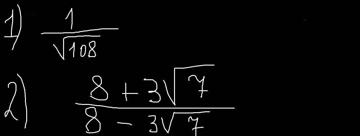 frac{1}{ sqrt{108} }= frac{1* sqrt{108} }{sqrt{108}*sqrt{108}}  = frac{ sqrt{108} }{108} = frac{6 sqrt{3} }{108} = frac{ sqrt{3} }{18}
