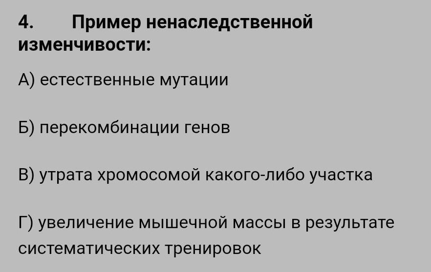 ненаследственная изменчивость не передается по наследству, а увеличение мышечной массы не является признаком, который передается по наследству, что не скажешь про остальные варианты.
