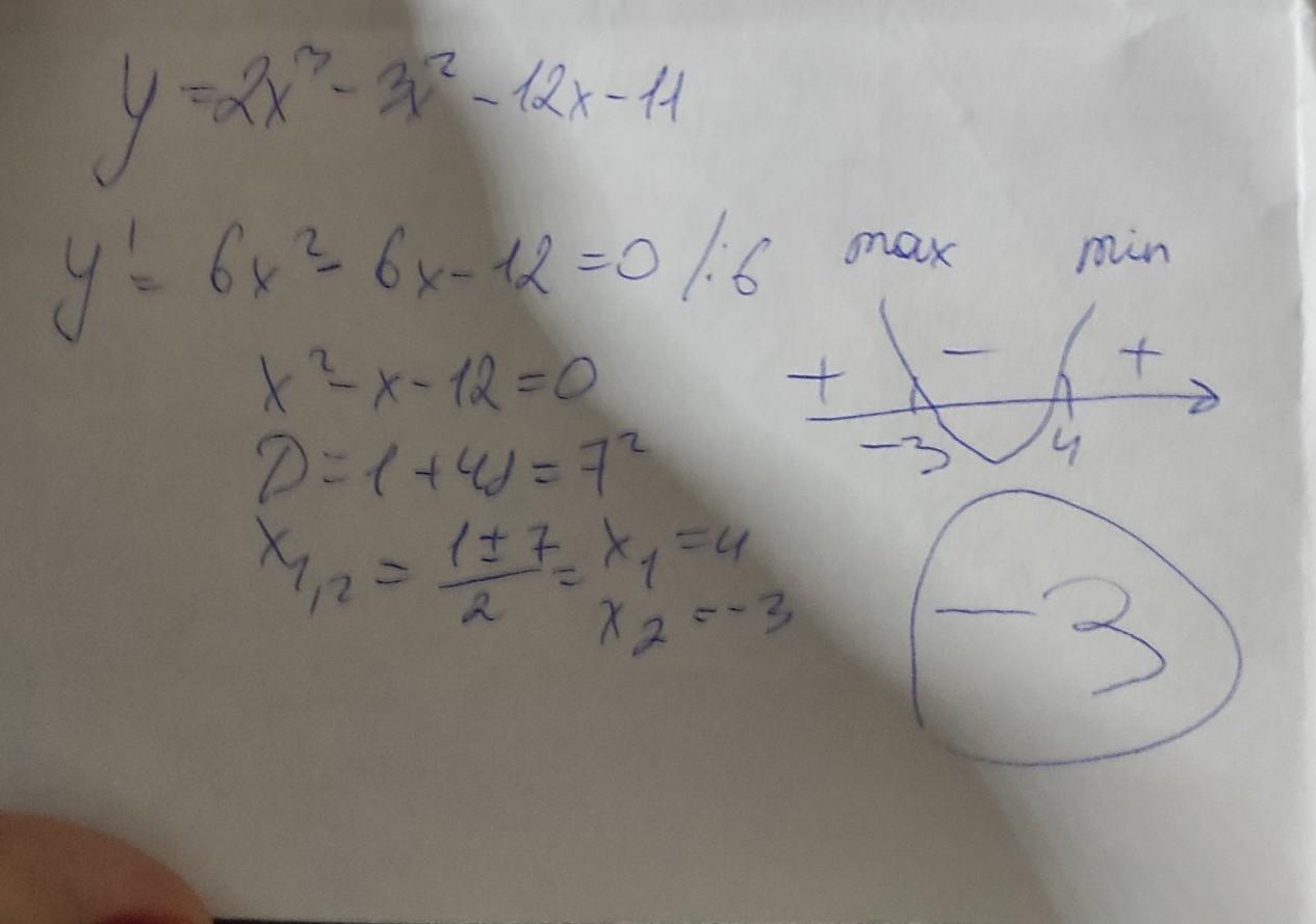Дана функция у=2x^3-3x^2-12х-11. Найти точку максимума. В ответе ввести ТОЛЬКО число. Если число отрицательное, то вводим без пробела. Пример записи:-6