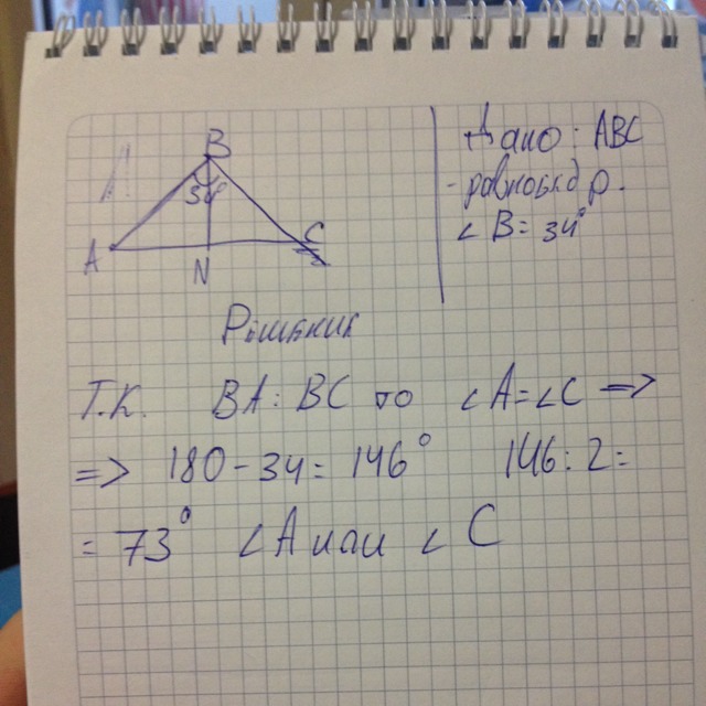 в равнобедренном треугольнике авс с основанием ав угол в равен 34 найдите угол между стороной ас и высотой ан этого треугольника