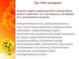 Недооцінюючи можливості, нестямлячись від обурення, недослухаючись до порад, недолюблюючи брехунів, недоївши яблука, неволячи сусідів, непокоячись про ячмінь, невгаваючи ні на хвилину, ненавидячи базік.