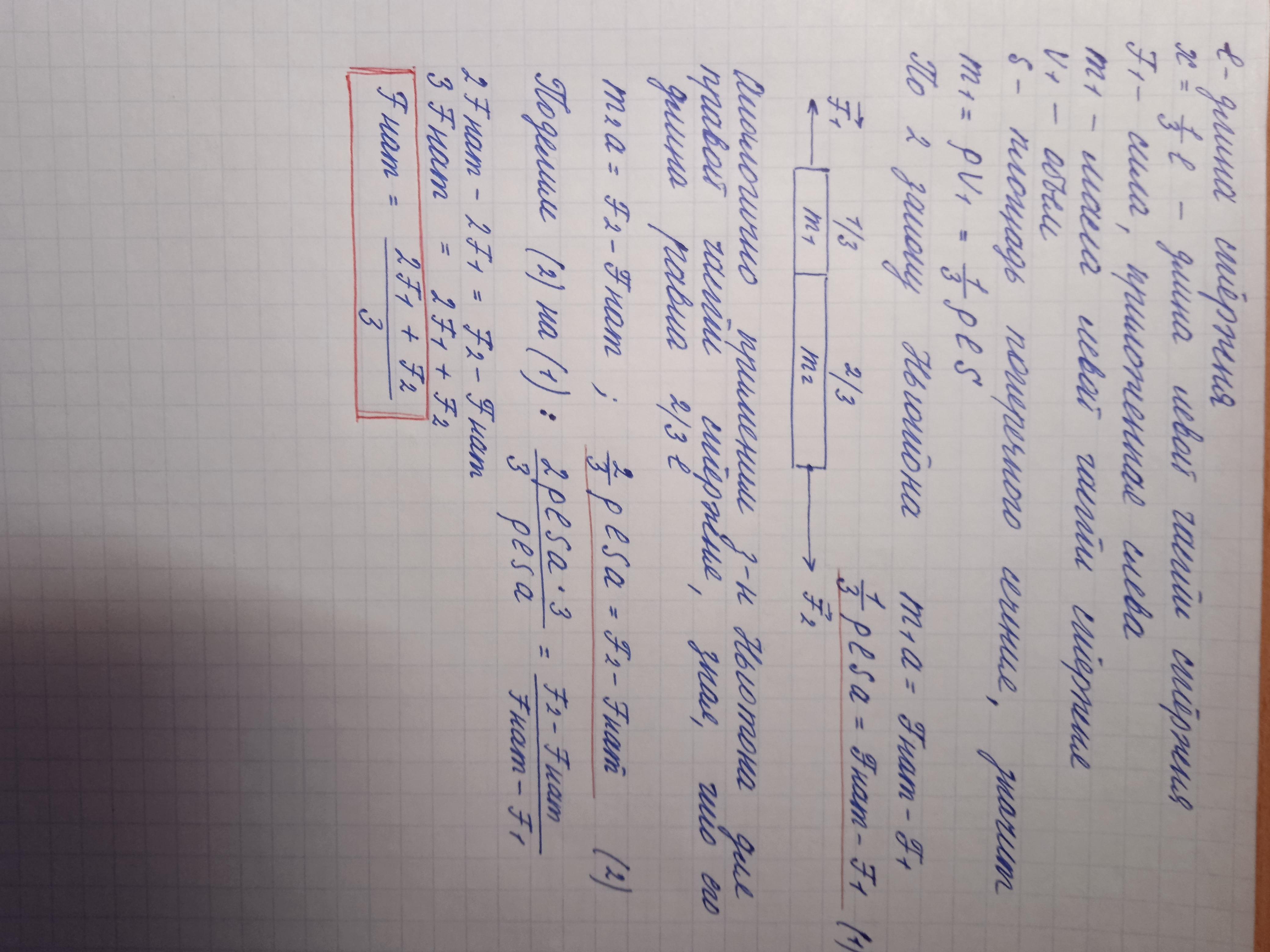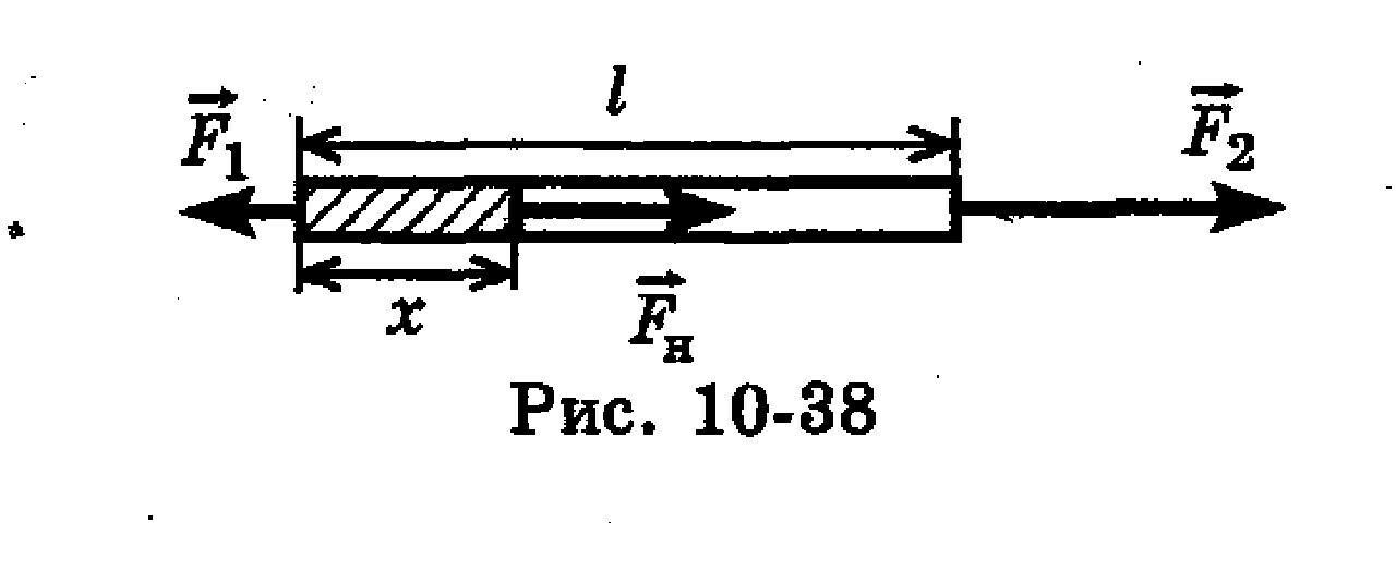 К концам однородного стержня длиной l приложены силы F1 и F2 (рис. 10-38). Какова сила натяжения стержня Fн в сечении, расположенном на расстоянии х, составляющем треть длины стержня от его левого конца?