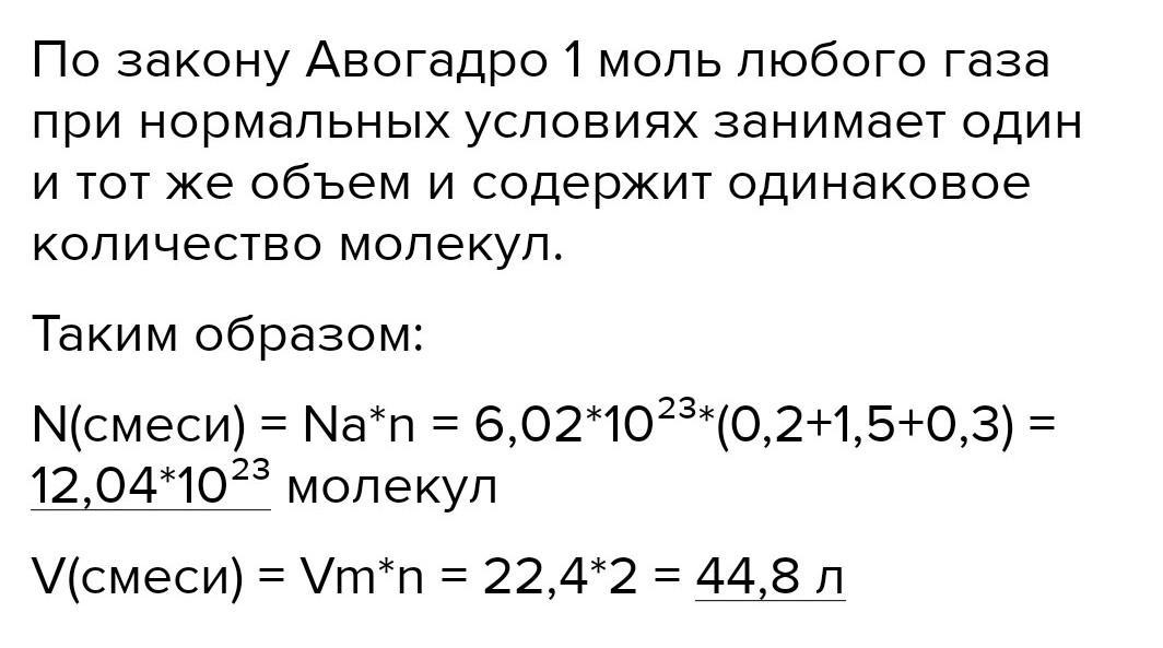 Сколько молекул имеется в смеси газов, содержащей 0,2 моля азота, 1,5 моля кислорода и 0,3 моля водорода и какой объём занимает эта смесь при нормальных условиях