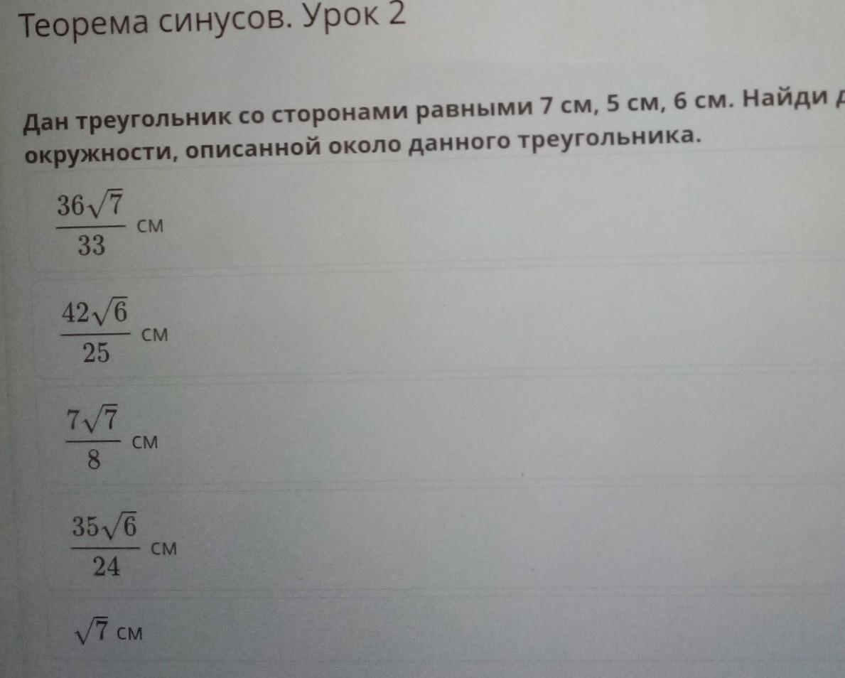 дан треугольник со сторонами равными 7 см, 5 см, 6 см. Найди длину радиуса окружности, описанной около данного треугольника