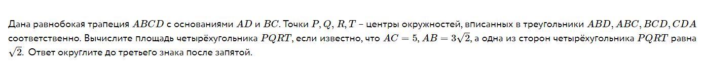Дана равнобокая трапеция ABCD с основаниями AD и BC. Точки P, Q, R, T – центры окружностей, вписанных в треугольники ABD, ABC, BCD, CDA соответственно.