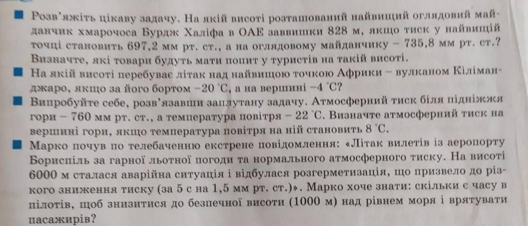 ■ На якій висоті перебуває літак над найвищою точкою Африки - вулканом Кiлiман джаро, якщо за його бортом -20 °С, а на вершині -4 °С?