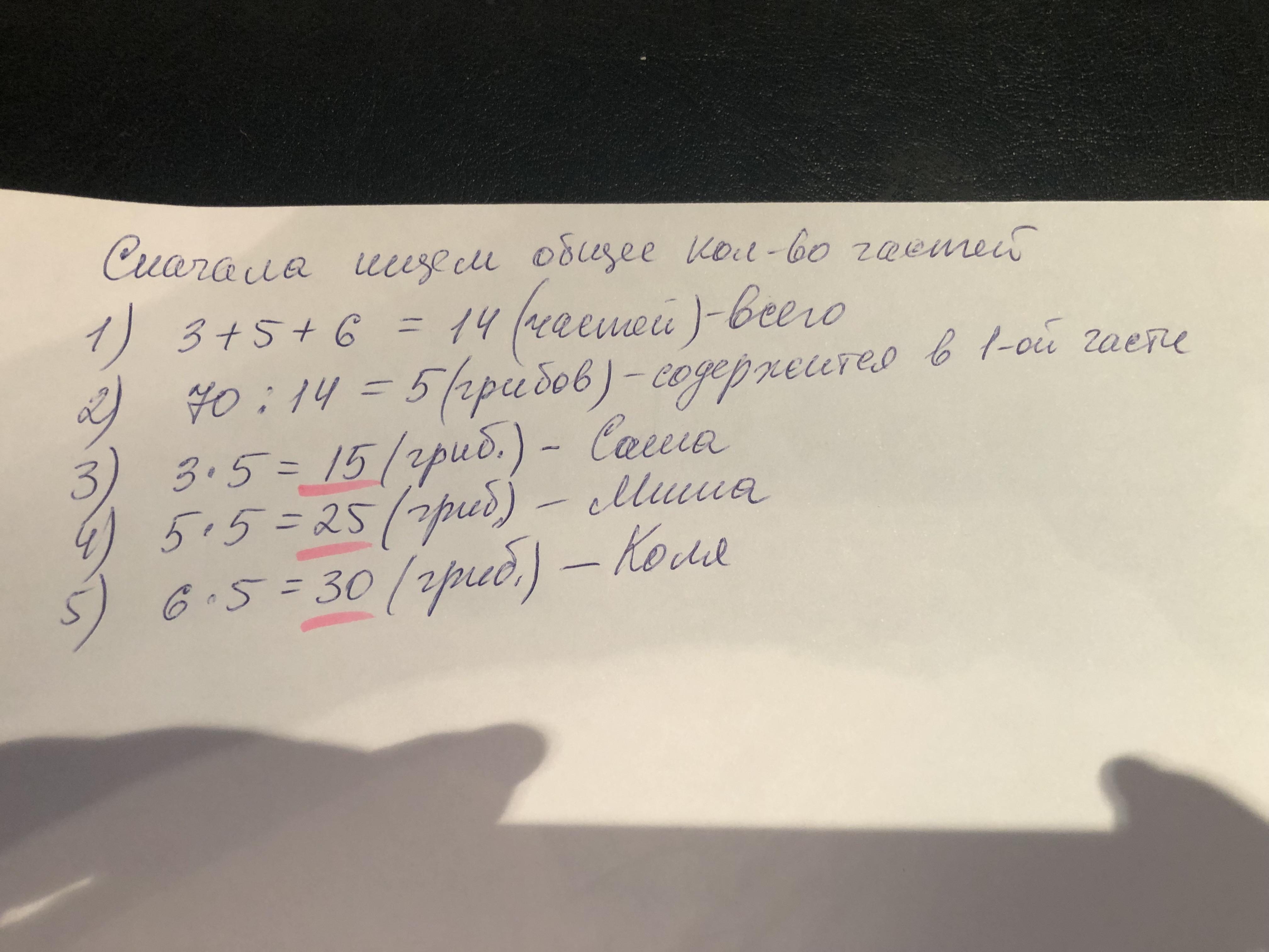 Ребята собрали 70 грибов. Найдите сколько грибов собрал каждый мальчик, если количество грибов, собранных Сашей, Мишей и Колей относятся как 3:5:6
