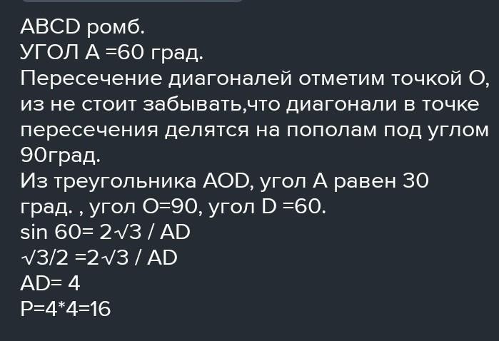 В ромбе один из углов равен 60 градусов . Высота ромба равна корень из 3см. Найдите периметр ромба. Дайте ответ в сантиметрах.