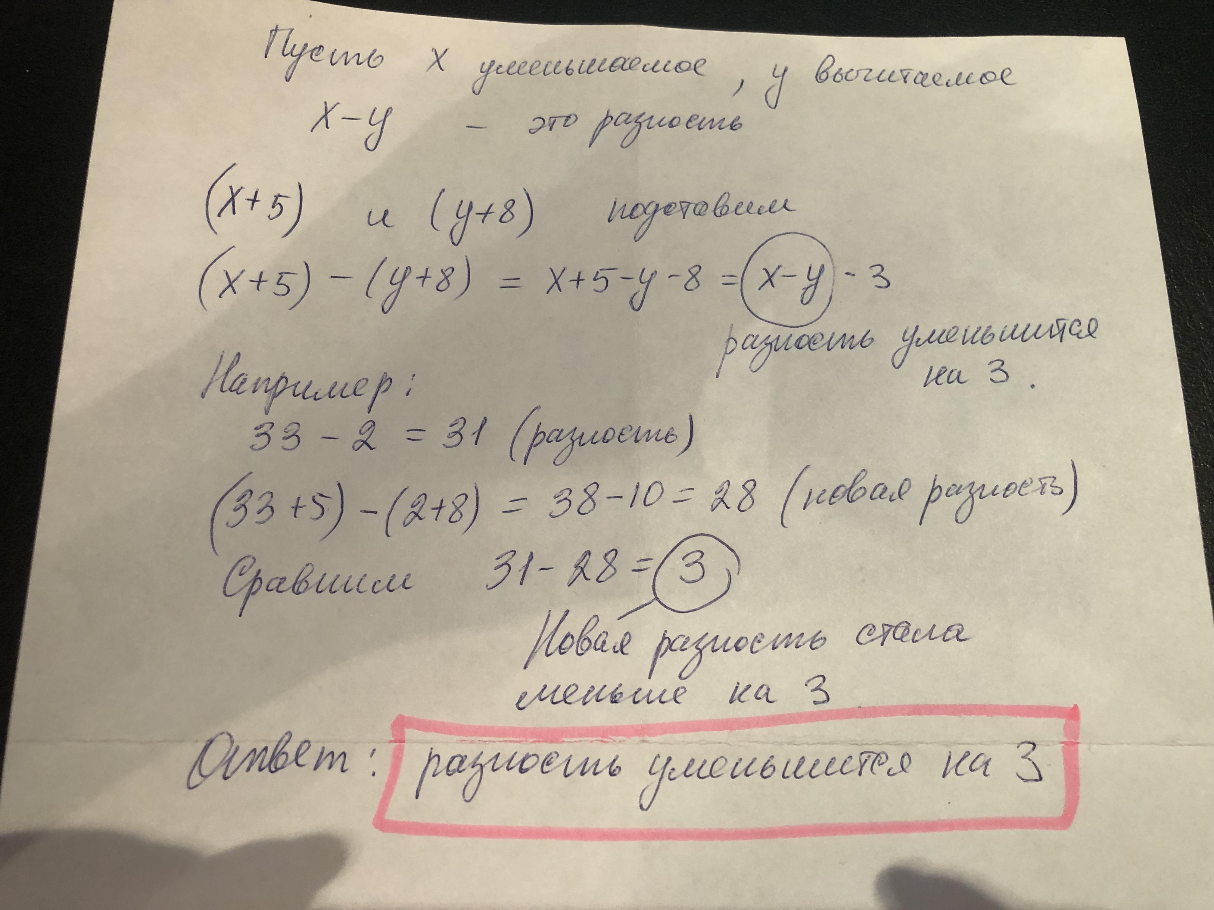 Как изменится разность двух чисел, если уменьшаемое увеличить на 5, а вычитаемое увеличить на 8?
