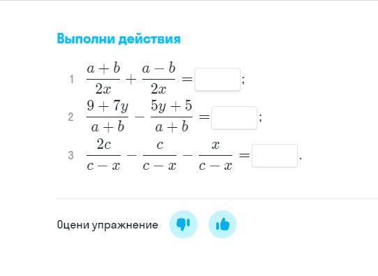 1)~\dfrac{a+b}{2x}+\dfrac{a-b}{2x}=\dfrac{a+b+a-b}{2x}=\dfrac{2a}{2x}=\dfrac{a}{x}\;;\\\\\\2)~\dfrac{9+7y}{a+b}-\dfrac{5y+5}{a+b}=\dfrac{9+7y-(5y+5)}{a+b}=\dfrac{9+7y-5y-5}{a+b}=\dfrac{4+2y}{a+b}\;;\\\\\\3)~\dfrac{2c}{c-x}-\dfrac{c}{c-x}-\dfrac{x}{c-x}=\dfrac{2c-c-x}{c-x}=\dfrac{c-x}{c-x}=1\;.