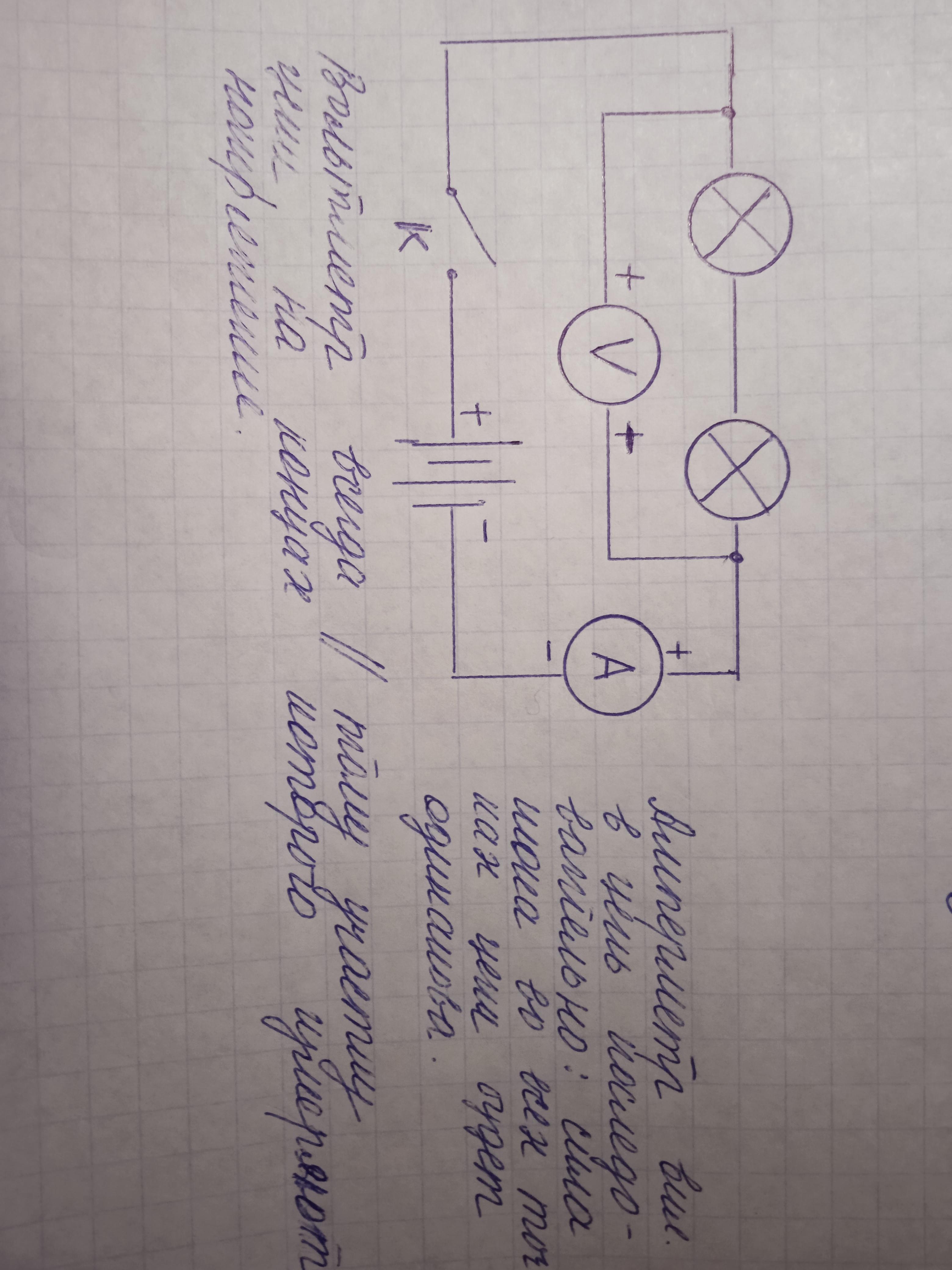 Начертите схему электрической цепи, состоящей из источника тока и двух последовательно соединенных ламп. Изобразите, как надо подключить амперметр и вольтметр для измерения силы тока в одной из ламп и напряжения на двух лампах.