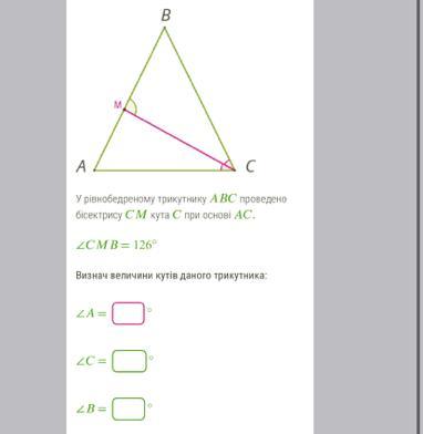 Так як СМ- бісектриса ∠С, то нехай ∠АСМ=х, тоді ∠А=2х, ∠АМС=180°-∠СМВ=180°-126°=54°( як суміжні кути)