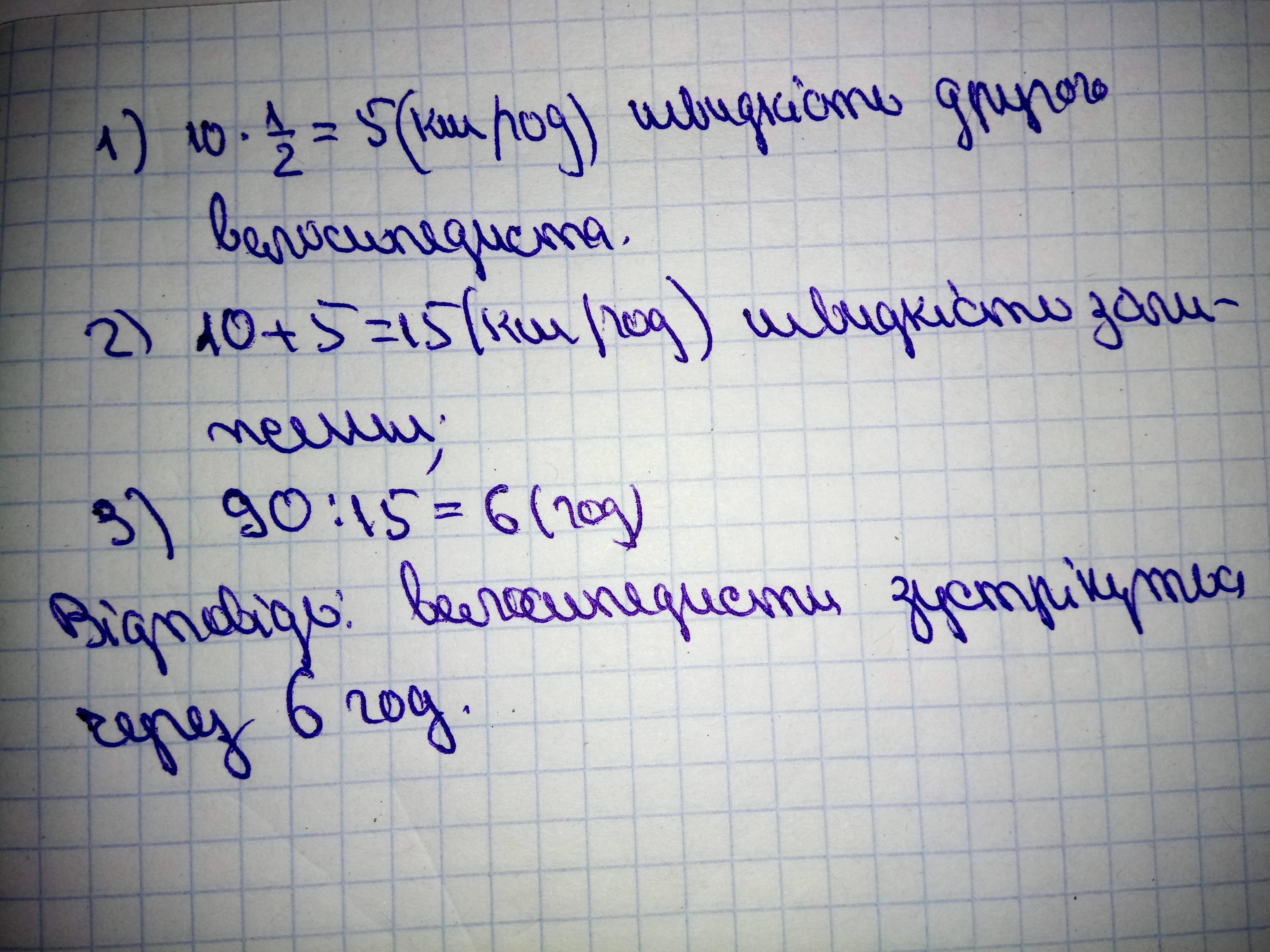 З двох сіл,відстань між якими 90 км,одночасно назустріч один одному виїхали два велосипедист.Швидкість першого-10 км/год а другого 1/2 швидкості першого.Через скільки годин велосипедисти зустрінуться ?