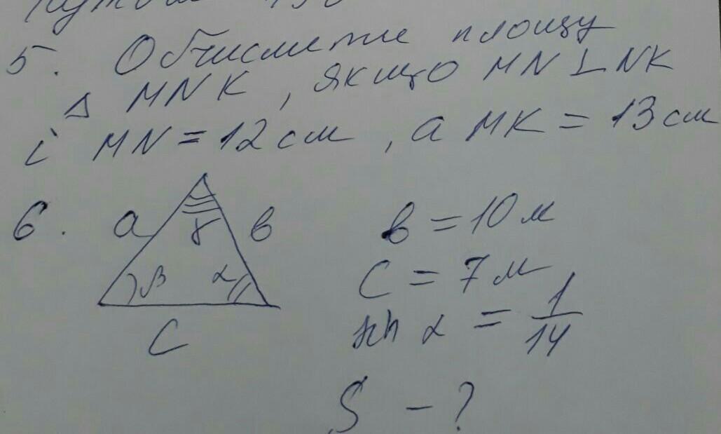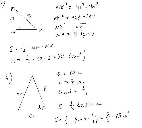5) используем теорему Пифагора, находим катет. Площадь равна половине произведения катетов