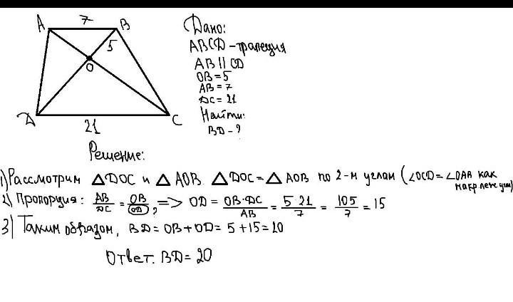 Диагонали трапеции ABCD с основаниями AB и CD пересекаются в точке O.Найти BD если известно, что OB=18, AB=34, DC=102