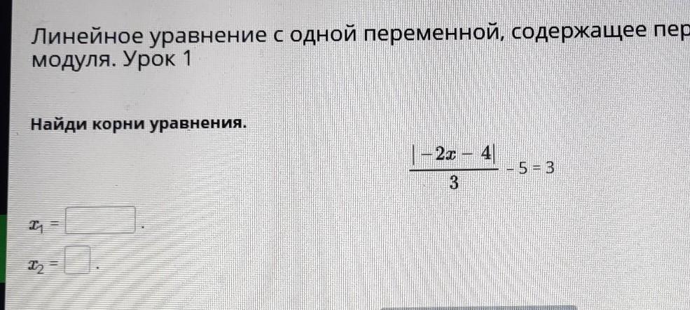 Линейное уравнение с одной переменной, содержащее переменную под знаком модуля. Урок 1 Найди корни уравнения. |-2x-4|/3 - 5=3