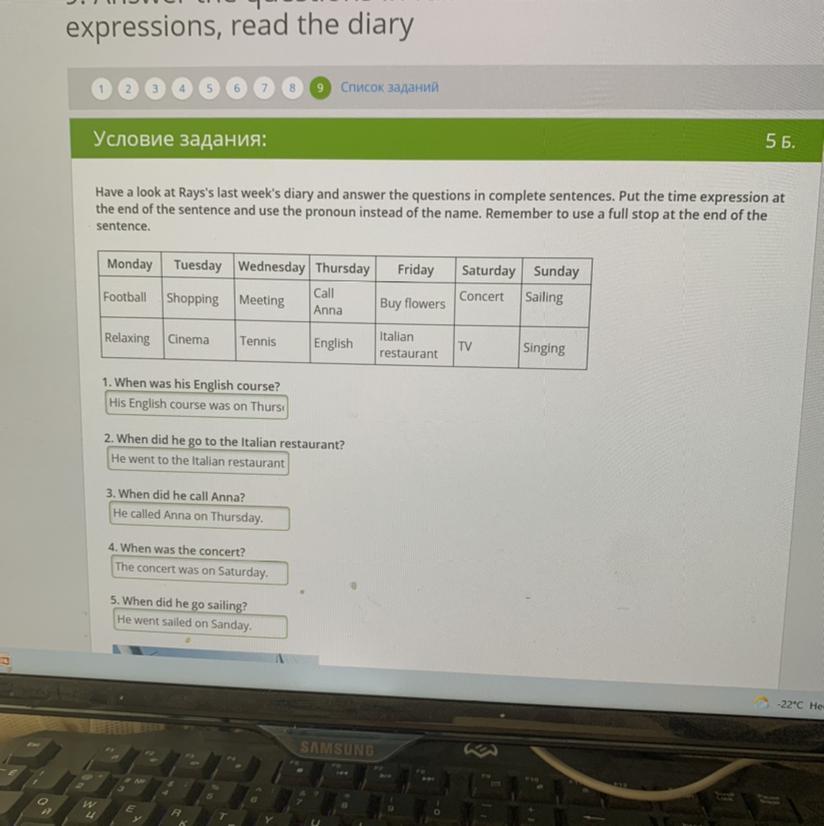 во втором, on Friday вы пропустили, либо оно не высвечивается и в пятом sailing это плавание существительное без ed должно быть