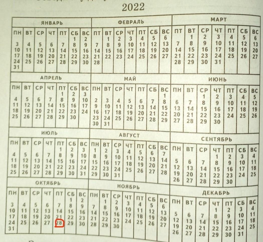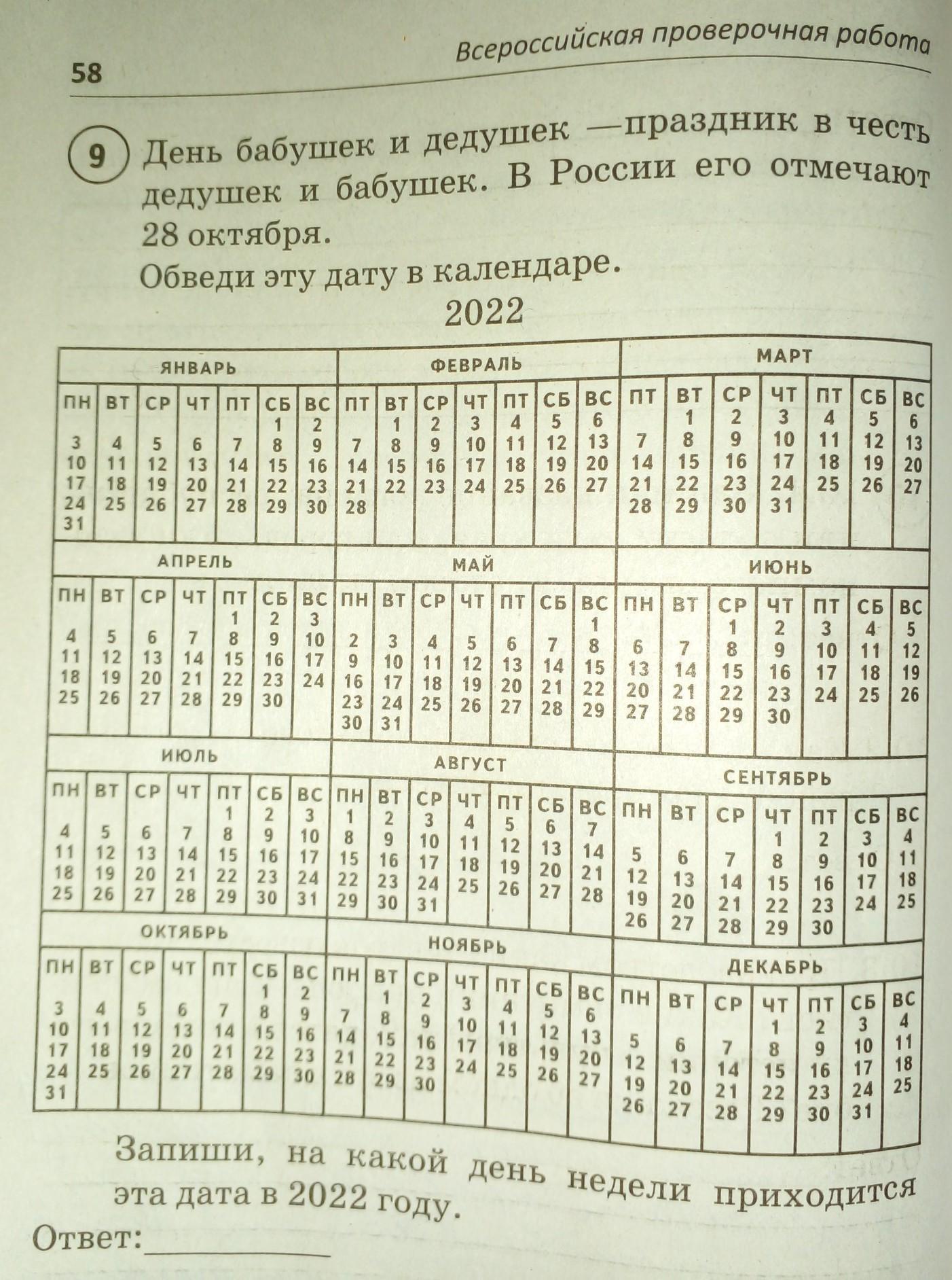 9) День бабушек и дедушек — праздник в честь дедушек и бабушек. В России его отмечают 28 октября. Обведи эту дату в календаре. 2022 ЯНВАРЬ ФЕВРАЛЬ МАРТ ПН ВТ СР ЧТ ПТ СБ ВС пт Вт Ср Чт Пт Сб Вс пт | ВТ СР ЧТ ПТ СБ | Вс 1 2 1 2 3 4 5 6 1 2 3 4 5 6 3 4 5 6 7 8 9 7 8 9 10 11 12 13 7 8 9 10 11 12 13 10 11 12 13 14 15 16 14 15 16 17 18 19 20 14 15 16 17 18 19 20 17 19 20 21 22 23 21 22 23 24 25 26 27 21 22 23 24 25 26 27 24 25 26 27 28 29 30 28 28 29 30 31 31 о Non -- NN - ол сода ар oo oo N un co - -ANO WN 18 АПРЕЛЬ МАЙ Июнь пн вт ср чт пт сб вс пн вт ср чт пт сб вс пн вт ср чт пт сб вс 1 2 3 1 1 2 3 4 5 5 6 7 8 9 10 2 3 4 5 6 7 8 6 7 8 9 10 11 12 11 12 13 14 15 16 17 9 10 11 12 13 14 15 13 14 15 16 17 18 19 18 19 20 21 22 23 24 16 17 18 19 | 20 21 | 22 20 21 22 23 25 26 27 28 29 30 23 24 25 26 27 28 29 27 28 30 30 31 neN owONS on - 24 25 26 оn NN 29 Июль АВГУСТ СЕНТЯБРЬ пн вт ср чт пт сб вс пн вт ср чт пт сб вс пн вт ср чт пт сб вс 1 2 3 1 2 3 4 5 6 7 1 2 4 5 6 7 8 9 10 8 9 10 | 11 | 12 1314 7 12 5 8 13 14 6 15 16 17 15 16 17 18 19 20 21 18 19 20 21 22 23 24 22 23 24 25 26 27 28 12 13 14 15 25 26 27 28 29 | 30 | 31 | 29 | 30 | 31 19 20 27 28 29 30 ОКТЯБРЬ НОЯБРЬ ДЕКАБРЬ 3 9 10 11 16 17 18 21 22 23 24 25 ос ON No NNA COAN о No7 26 MH BTCP TOT CBC OH BTCP TOT Colector BTCP TOT C6 1 2. 1 2 3 4 5 6 3 4 5 6 7 В 9 7 8 9 10 11 | 12 | 13 10 11 12 13 15 16 14 15 16 | 17 18 19 20 17 18 19 20 21 22 23 21 22 23 24 25 26 27 24 25 26 27 28 | 29 | 30 | 28 29 30 31 5 12 19 26 oo Nл 13 20 27 Noon 7 14 21 28 о Non cas 1 8 15 22 29 NN 2 3 4 9 10 11 16 17 18 23 24 25 30 31 сад 2 NN Запиши, на какой день недели приходится эта дата в 2022 году. Ответ: помогите даю 15 баксов