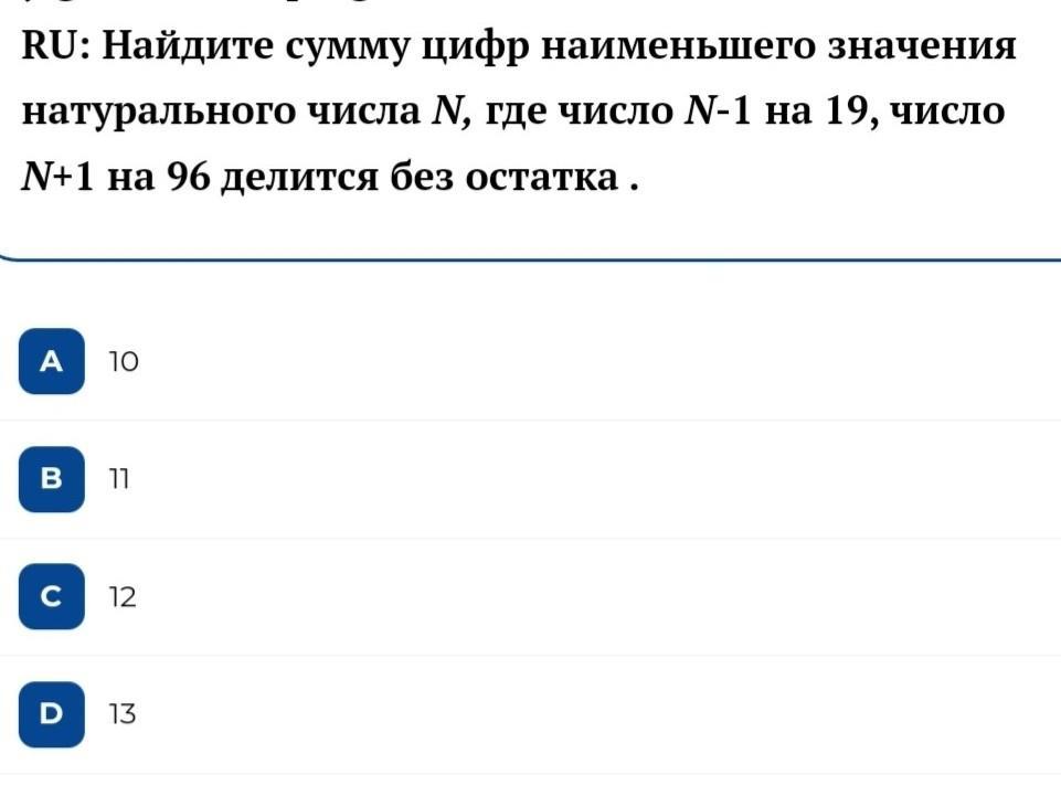 Получаем, что наименьшее число N-1 нацело поделившееся на 19 - 190. Теперь ищем N: 190+1=191. N=191. Ищем сумму чисел: 1+9+1=11.