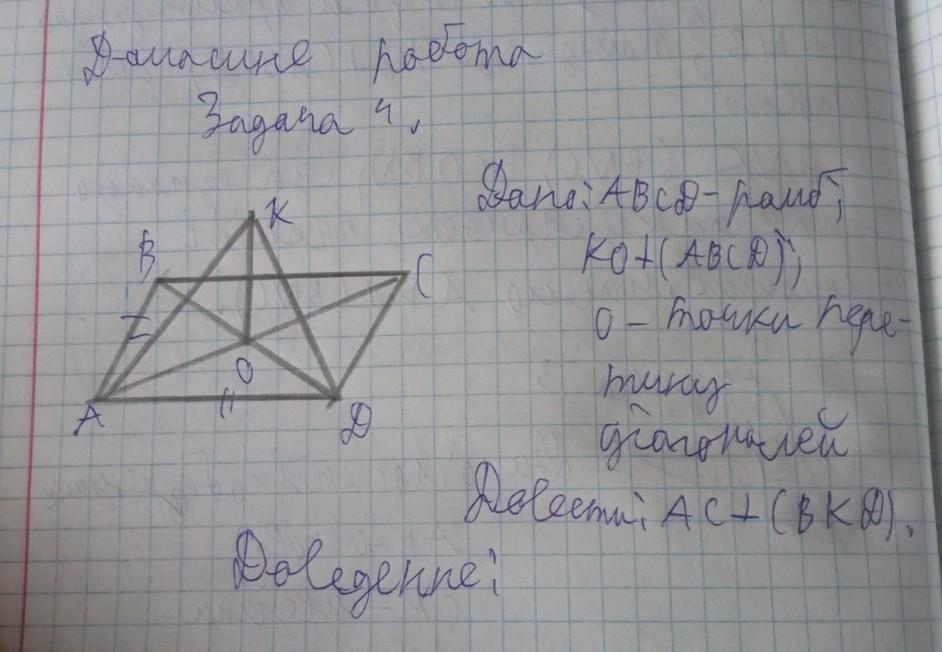 Вспомним признак перпендикулярности прямой и плоскости: если прямая перпендикулярна двум пересекающимся прямым, лежащим в данной плоскости, то прямая перпендикулярна всей плоскости. По свойству ромба диагональ AC перпендикулярна диагонали BD, которая ещё и лежит в плоскости BKD, одна прямая есть. В плоскости BKD есть прямая KO, которая перпендикулярна всей плоскости ABC, а значит и перпендикулярна прямой AC. Мы получили, что AC перпендикулярна BD и KO, BD и KO лежат в плоскости BKD, а также пересекаются в точке О, из всего вышесказанного следует, что АС перпендикулярна плоскости BKD, что и требовалось доказать