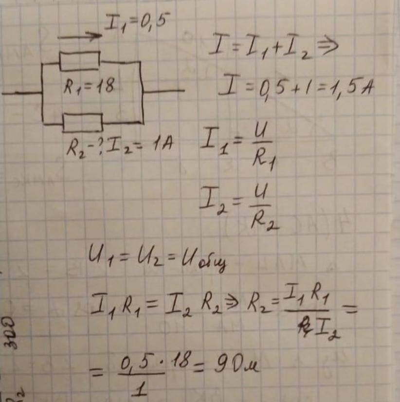 Решить задачу: Два резистора соединены параллельно. Сила тока в первом резисторе 0,5 А, во втором — 1 А. Сопротивление первого резистора 18 Ом. Определите силу тока на всем участке цепи и сопротивление второго резистора.