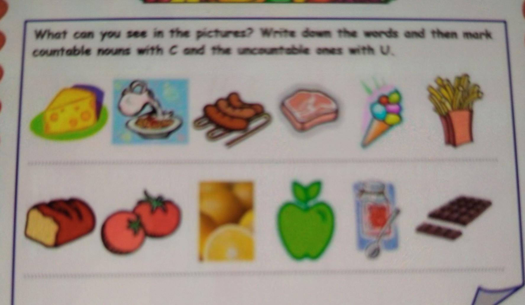 What can you see in the pictures? Write down the words and then mark countable nouns with C and the uncountable ones with U.