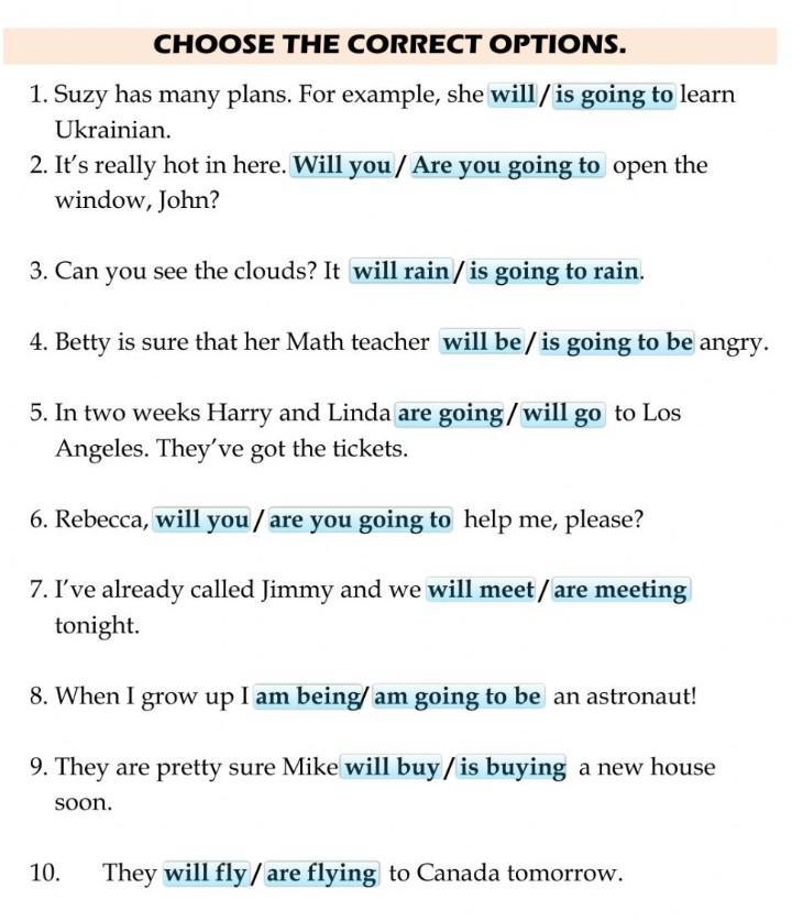 CHOOSE THE CORRECT OPTIONS. 1. Suzy has many plans. For example, she will / is going to learn Ukrainian 2. It's really hot in here. Will you / Are you going to open the window, John? 3. Can you see the clouds? It will rain / is going to rain. 4. Betty is sure that her Math teacher will be / is going to be angry. 5. In two weeks Harry and Linda are going/ will go to Los Angeles. They've got the tickets. 6. Rebecca, will you/ are you going to help me, please? 7. I've already called Jimmy and we will meet/ are meeting tonight. 8. When I grow up I am being/ am going to be an astronaut! 9. They are pretty sure Mike will buy/is buying a new house Помогите пожалуйста.