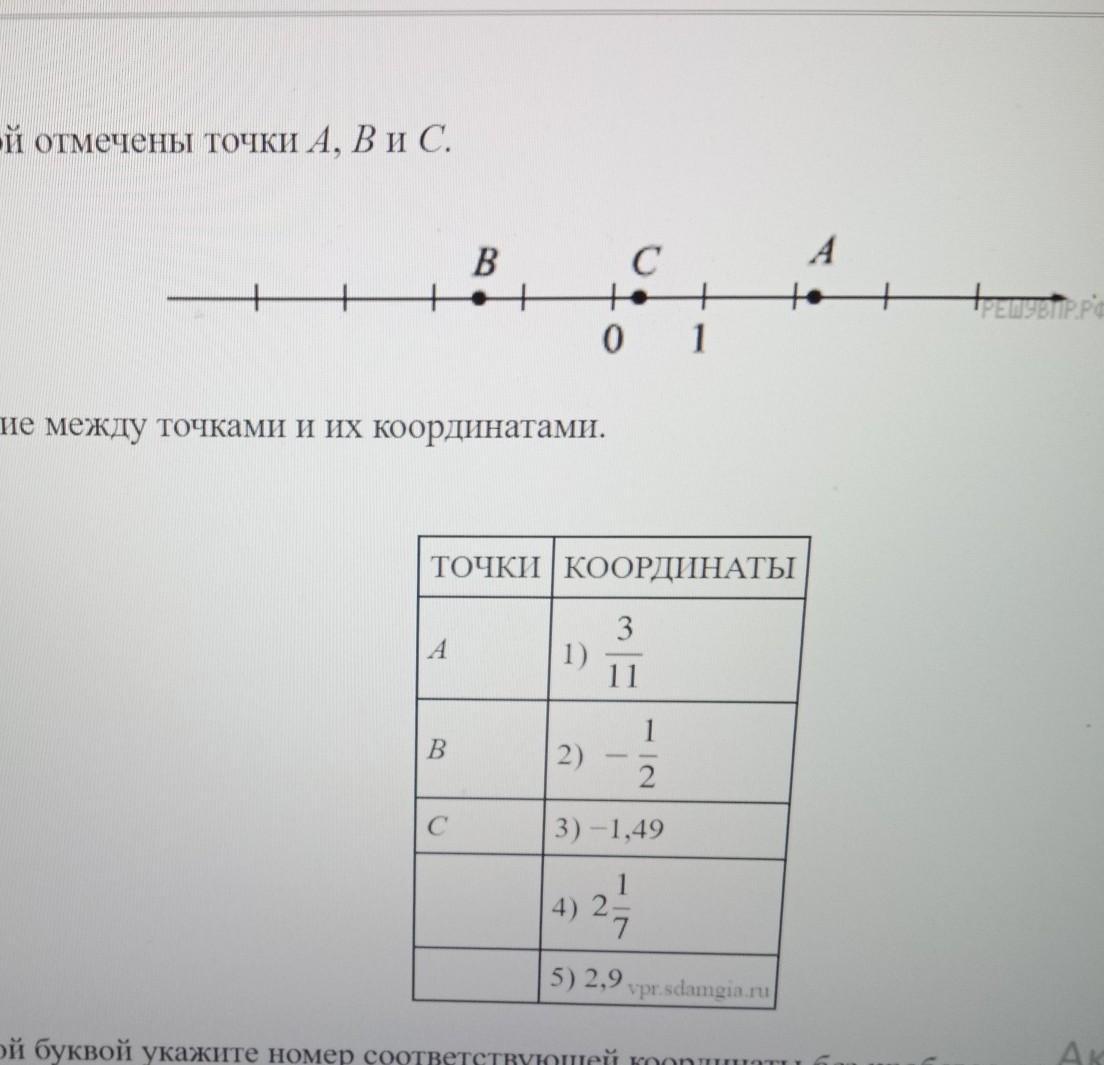 задание 8 N 480 На координатной прямой отмечены точки A, B и C. А В + с + + 0 1 ТРЕШУВерф Установите соответствие между точками и их координатами. ТОЧКИ КООРДИНАТЫ 3 A 1) 11 1 B 2) 2 с 3) -1,49 1 4) 25 7 5) 2,9 vрт. sdamgia.ru