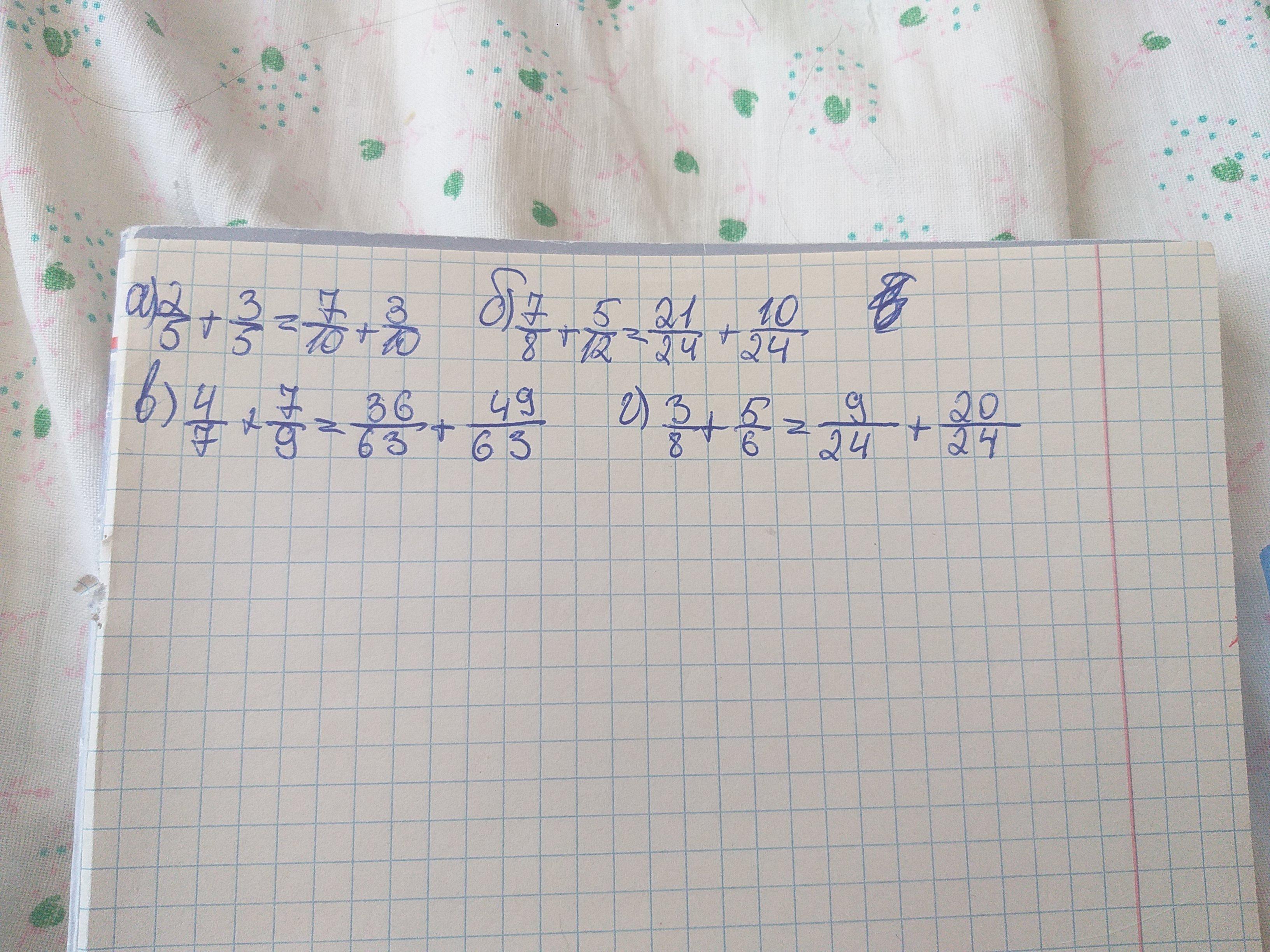 а)2/5+3/5=?/10+3/10 б)7/8+5/12=?/24+?/24 в)4/7 +7/9=?/63+?/63 г)3/8+5/6=?/24+?24 СКАЖИТЕ СРОЧНО ПОЖАЛУЙСТА ОТВЕТ ПРОШУ!!!