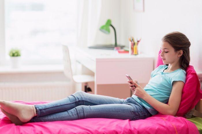 a young girl lies in the middle of the room on the bed and looks at the phone