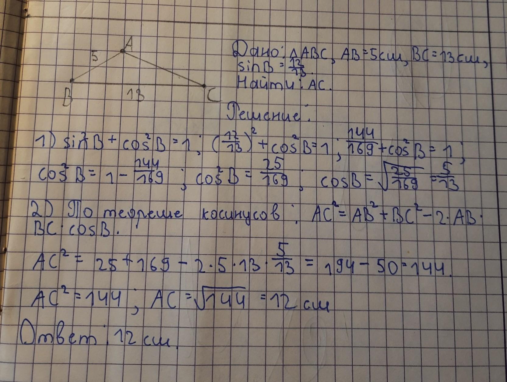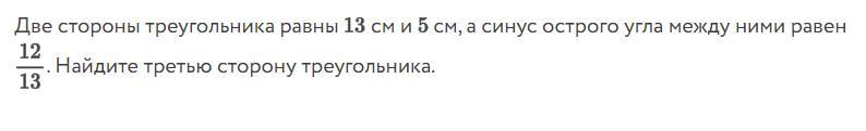 Две стороны треугольника равны 13 см и 5 см а синус острого угла между ними равен 12 / 13. Найдите третью сторону треугольника.