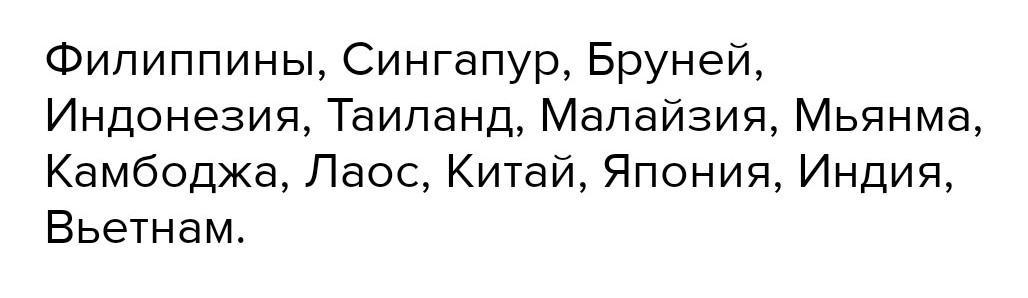 Филиппины, Сингапур, Бруней, Индонезия, Таиланд, Малайзия, Мьянма, Камбоджа, Лаос, Китай, Япония, Индия, Вьетнам.