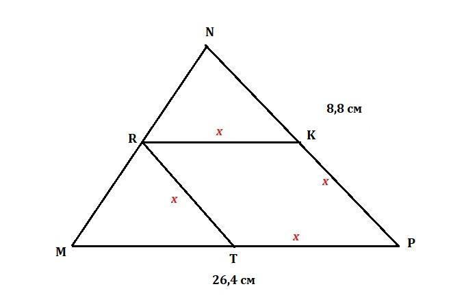 Чему равна сторона ромба RTPK, если стороны треугольника МP и NP равны 26,4 см и 8,8 см, соответственно.