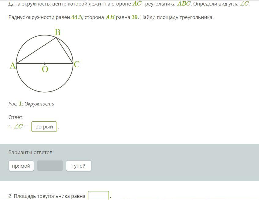 так как сторона совпадает с диаметром то вписаный в окружность треугольник - прямоугольный, раз один угол прямой то сумма других равна 180-90=90 значит любой другой угол кроме прямого угла В будет острым (меньше 90)