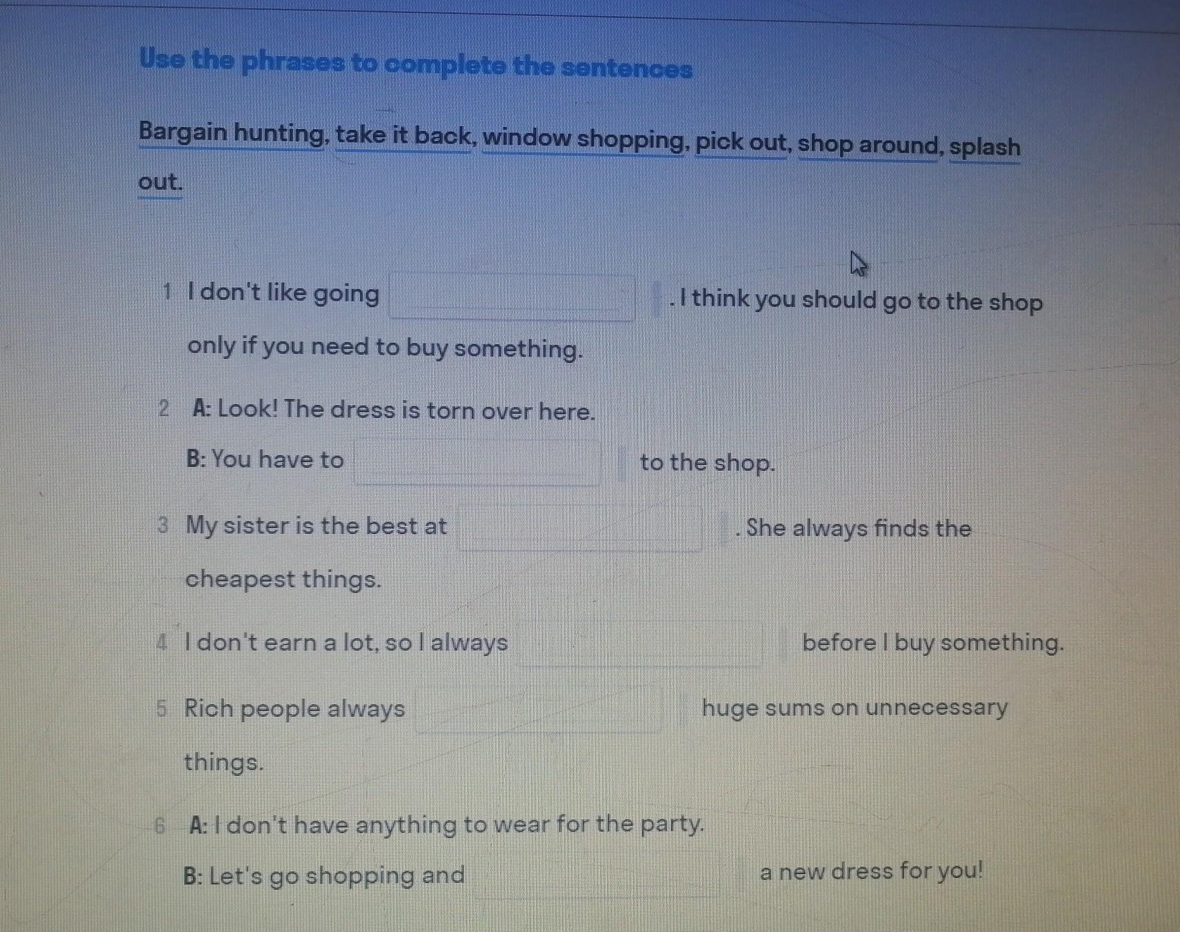 Bargain hunting, take it back, window shopping, pick out, shop around, splash out. 1 I don't like going .I think you should go to the shop only if you need to buy something. 2 A: Look! The dress is torn over here. B: You have to to the shop. 3 My sister is the best at She always finds the cheapest things. 4 I don't earn a lot, so I always before I buy something. 5 Rich people always huge sums on unnecessary things. 6 A: I don't have anything to wear for the party. B: Let's go shopping and a new dress for you! Помогите пожалуйста.