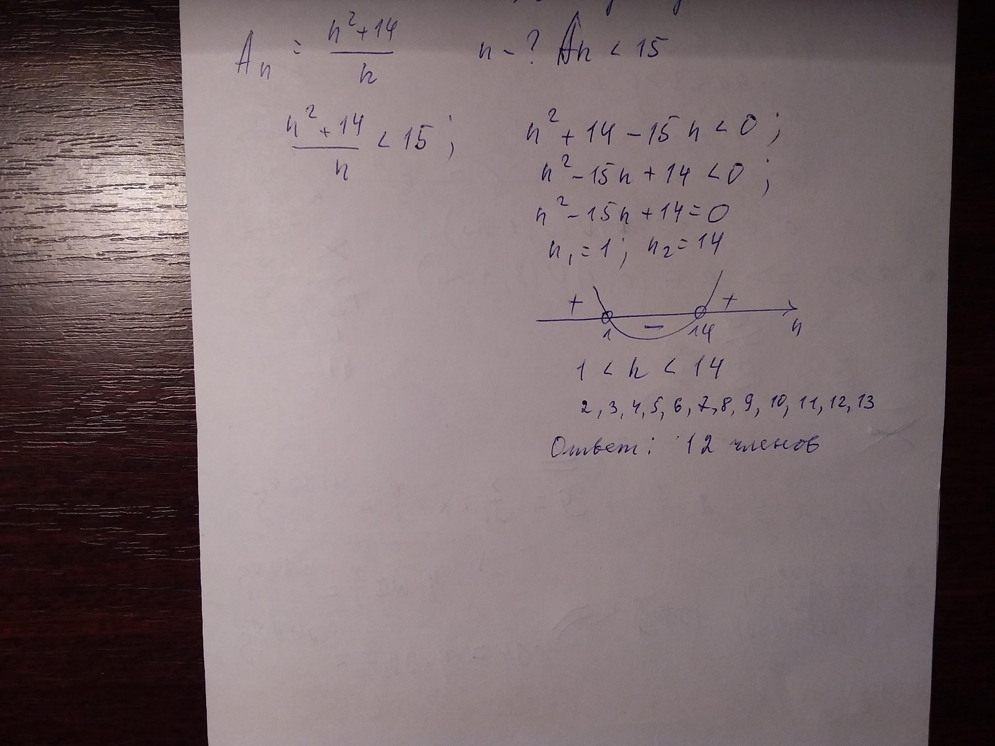 Последовательность задана формулой An=n^2+14/n (/ - дробь) Сколько членов этой последовательности меньше 15?