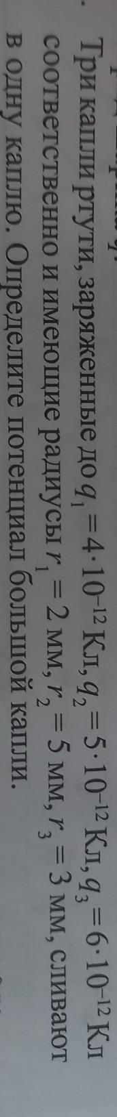 Три капли ртути, заряженные до q1=4×10^-12 Кл, q2=5×10^-12Кл,q3=6×10^-12Кл соответственно и имеющие радиусы r1=2мм, r2=5мм, r3=3мм, сливают в одну каплю. Определите потенциал большой капли.