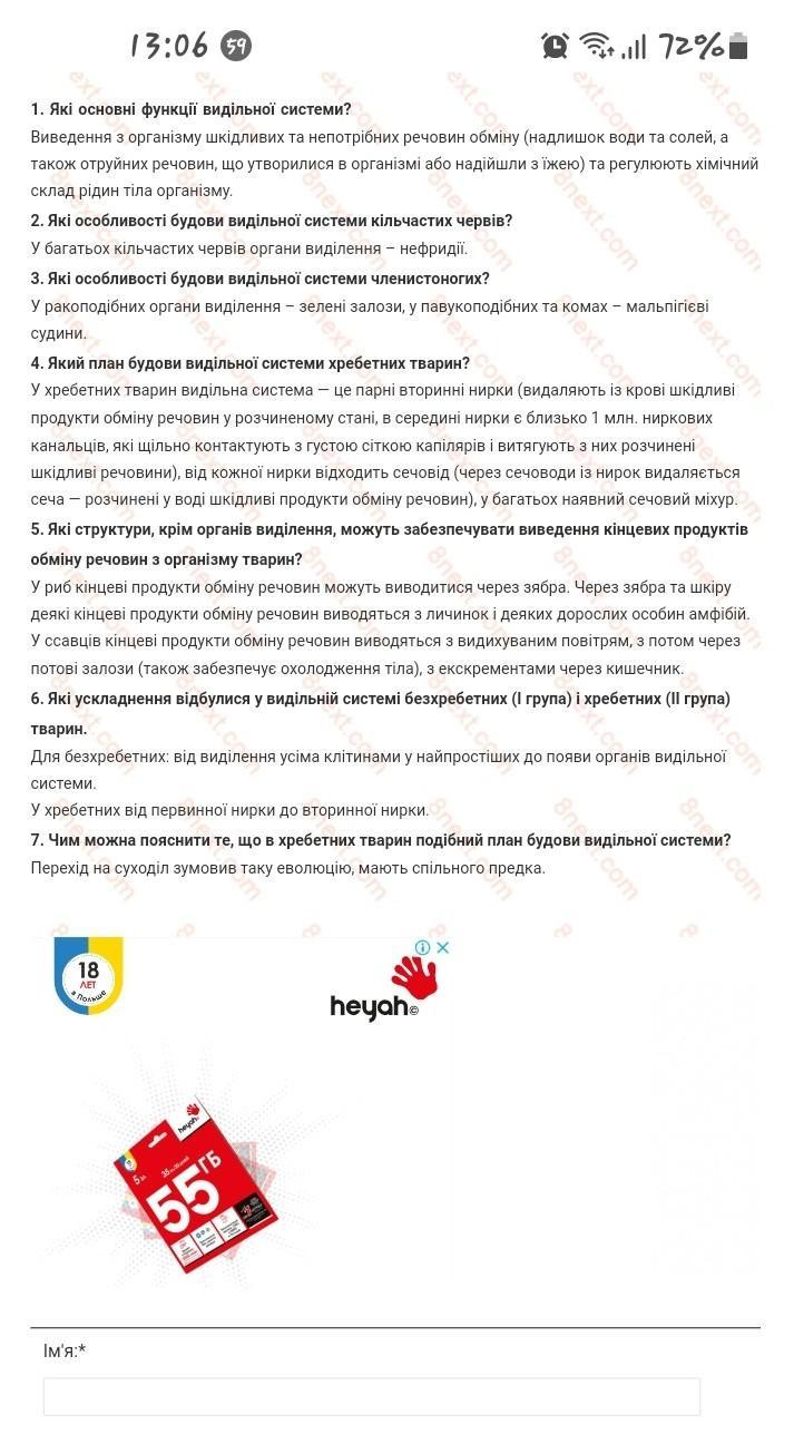 1. Які основні функції видільної системи? 2. Які особливості будови видільної системи кільчастих червів? 3. Які основні функції видільної системи членистоногих? 4. Який план будови видільної системи хребетних тварин? 5. Які структури, крім органів видільння, можуть забезпечувати виведення кінцевих продуктів обміну речовин з організму тварин?
