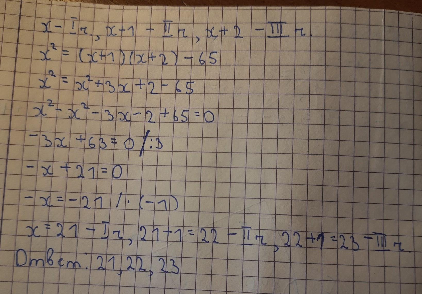 . Найдите три последовательных натуральных числа, если известно, что квадрат меньшего из них на 65 меньше произве- дения двух остальных.