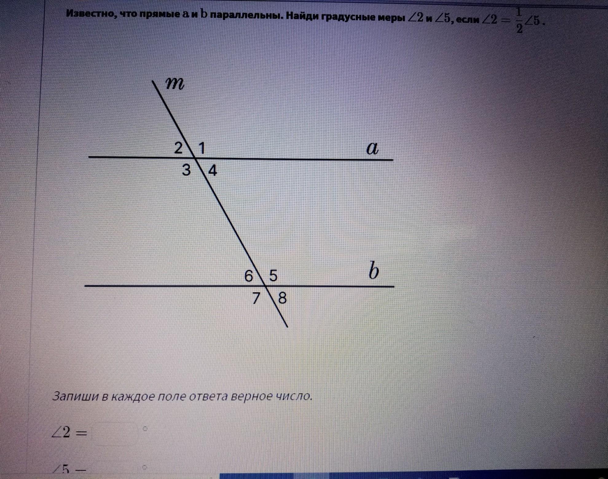 Известно, что прямые a и b параллельны. Найди градусные меры угла2 и угла 5, если угол2 = 1/2 угол5