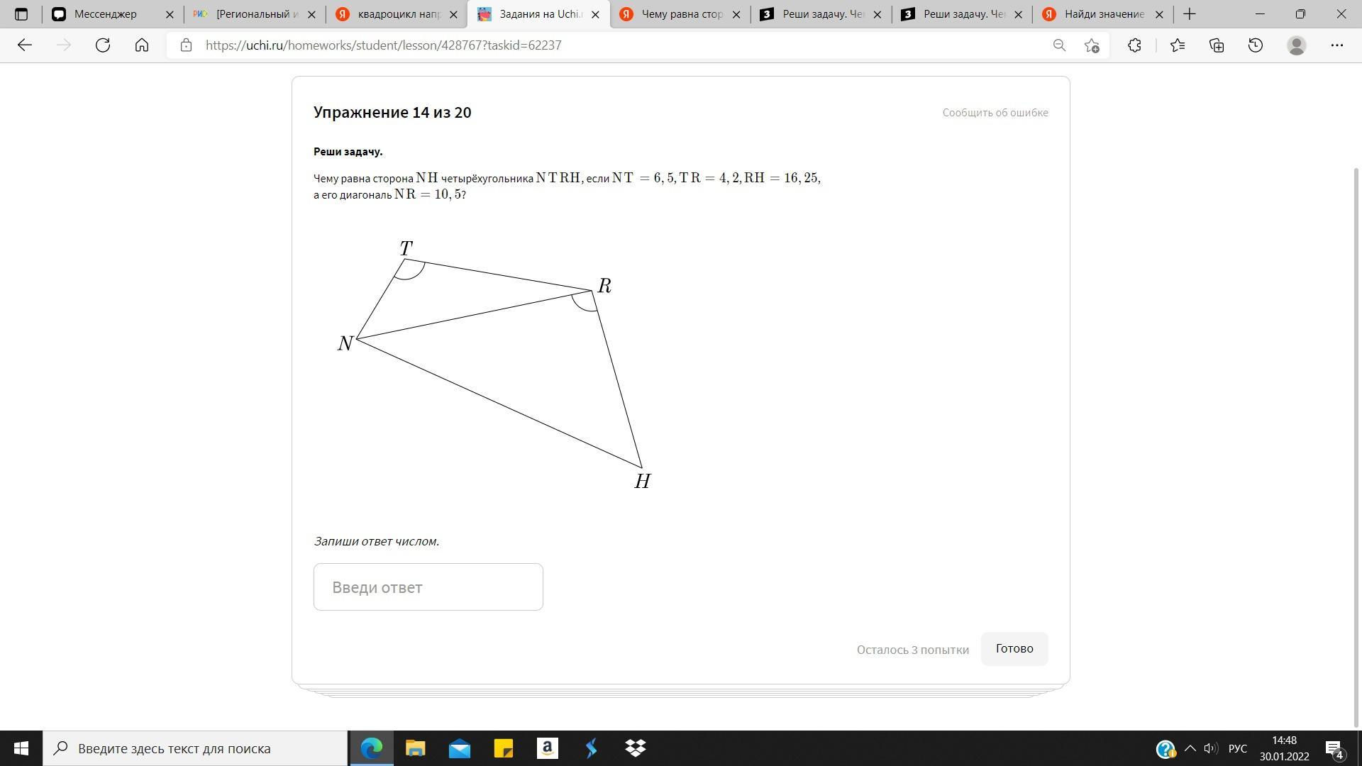 Чему равна сторона NH четырёхугольника NTRH, если NT=6,5, TR=4,2, RH=16,25, а его диагональ NR=10,5?