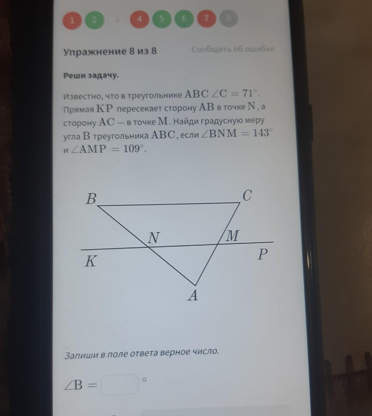 сперва ищем угол mna 180-143=37⁰(так как углы bnm и mna смежные и их сумма =180⁰).По такой же схеме ищем nma 180-109=71⁰. теперь просто находим угол а зная что сумма всех углов 180⁰( мы берем маленький треугольник NMA, в котором уже знаем 2 угла) 180-(71+37)=72⁰. и теперь нам известны углы А и С. находим B аналогично B=180-(72+71)=37⁰