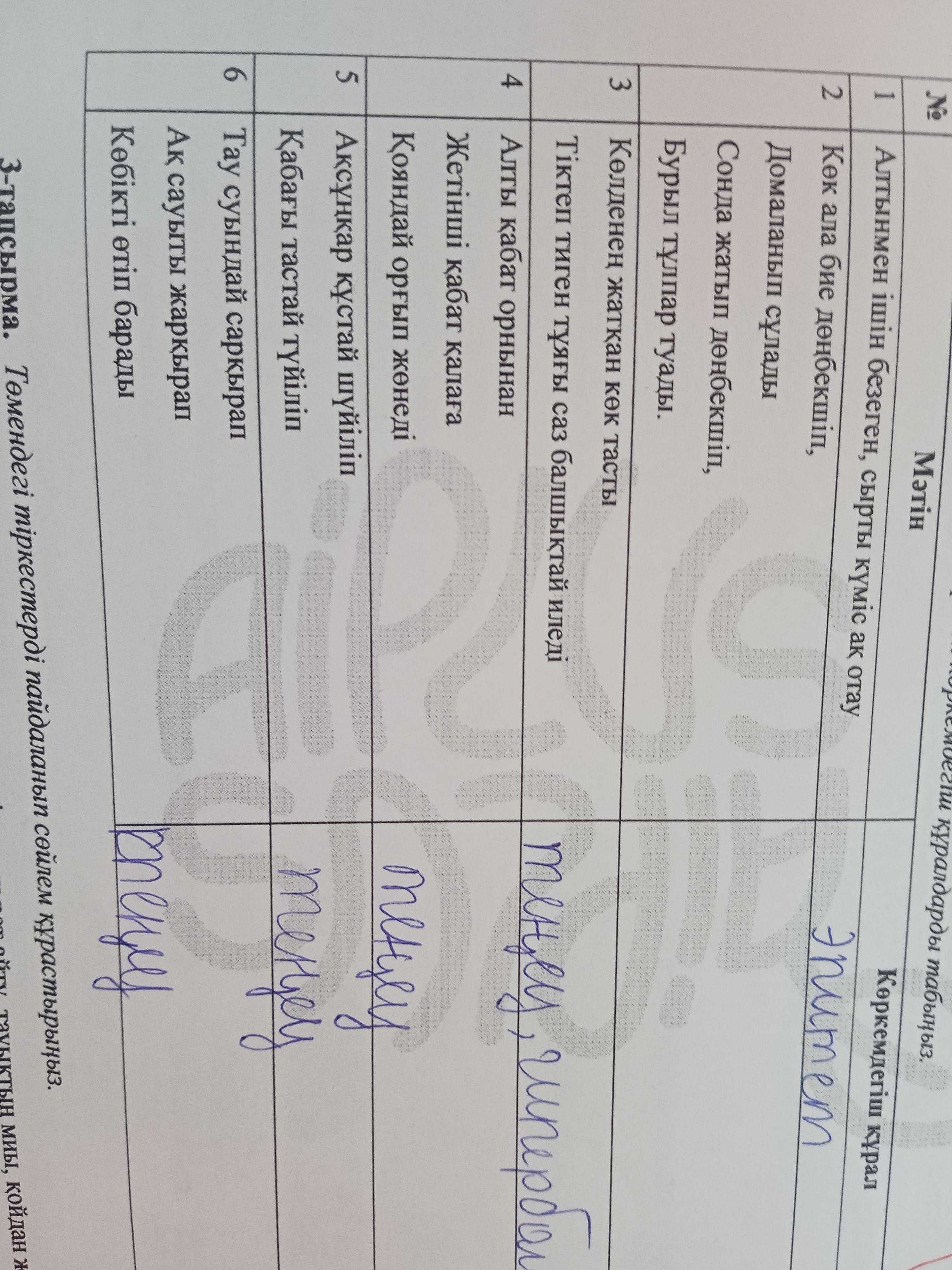 2 2-тапсырма шығарма үзінділерінен көркемдегіш құралдарды табыңыз. Ng Мәтін Көркемдегіш құрал 1 Алтынмен ішін безеген, сырты күміс ақ отау 2 Көк ала бие дөңбекшіп, Домаланып сұлады Сонда жатып дөңбекшіп, Бурыл тұлпар туады. 3 Көлденең жатқан көк тасты Тіктеп тиген тұяғы саз балшықтай иледі лабоо 4 Алты қабат орнынан Жетінші қабат қалаға. 5 Қояндай орғып жөнеді Ақсұңқар құстай шүйіліп Қабағы тастай түйіліп 6 Тау суындай сарқырап Ақ сауыты жарқырап Көбікті өтіп барады 2 топорно Tлал: ала: nam Палим па 12