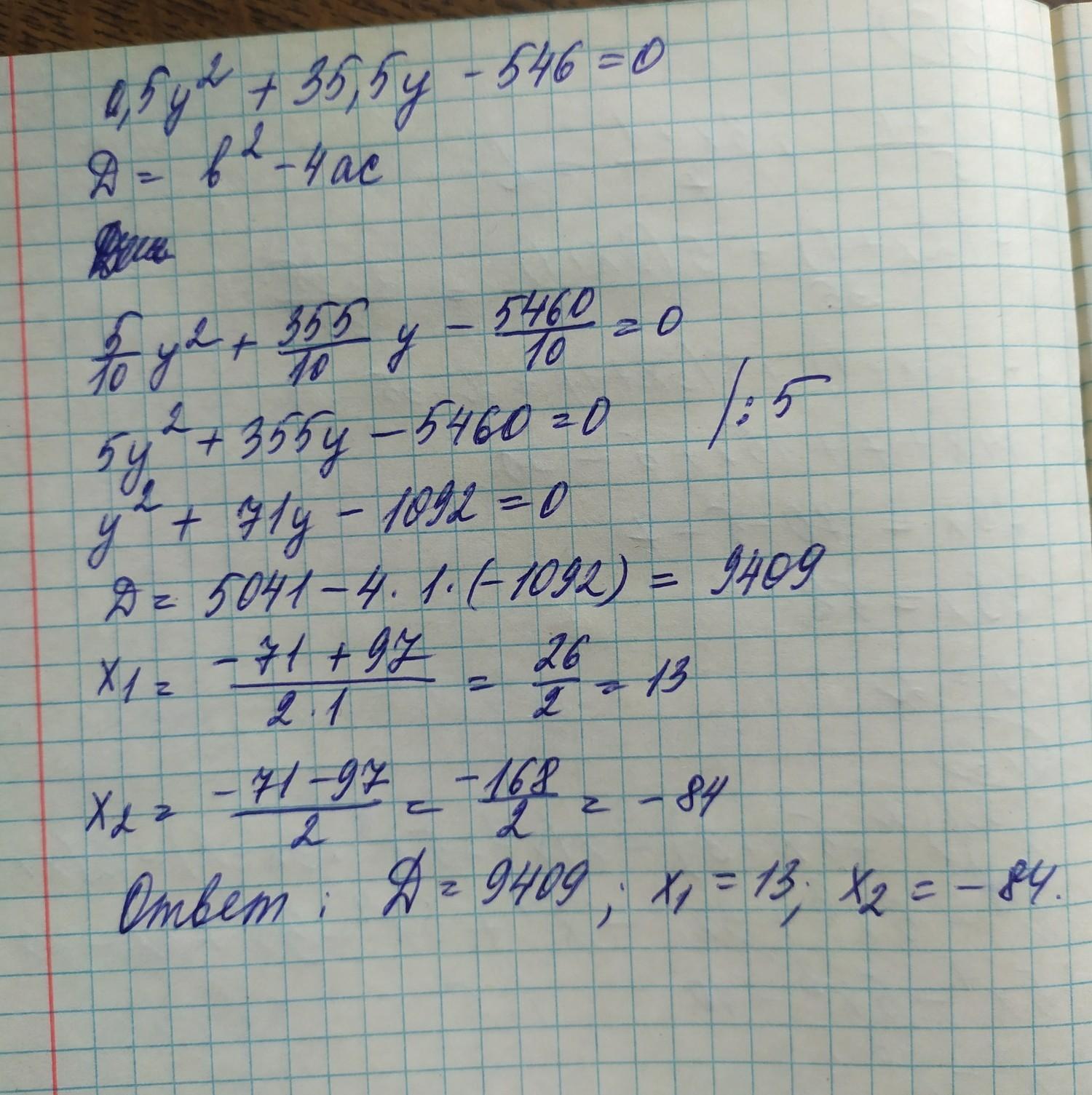 0,5y+35,5y-546=0Д=b(в квадрате)-4ac= 35,5(в квадрате)-4*0,5*546=1260,25-1092=168,25