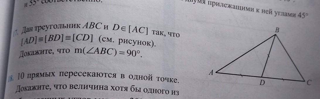 Точка D одинаково удалена от вершин треугольника. Следовательно, точка D центр описанной окружности и АС - это диаметр. Угол АВС - вписанный и измеряется половиной дуги, на которую опирается. Но в данном случае половина дуги равна 180:2 = 90.