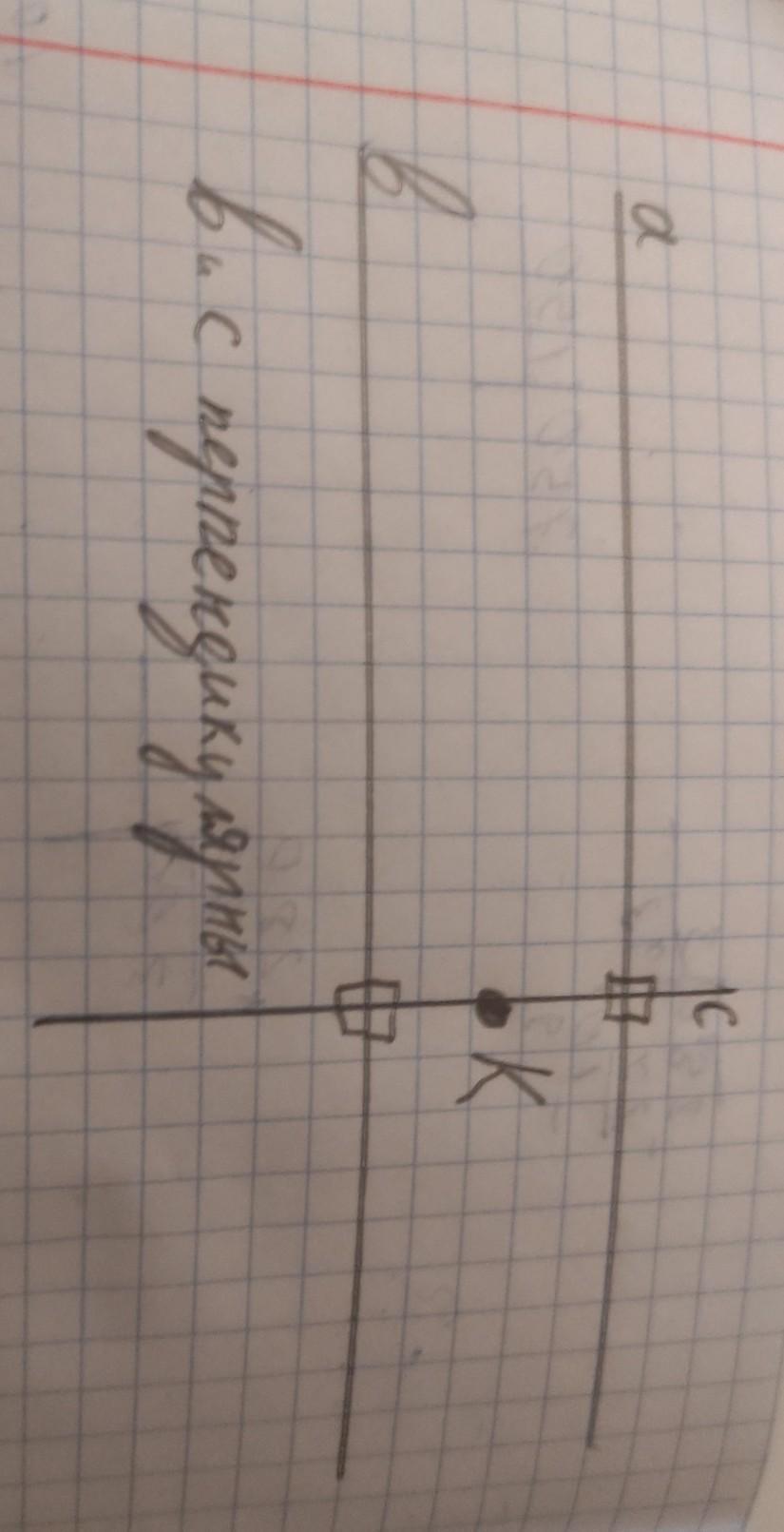 5. Начерти параллельные прямые а и б отметь точку к, не лежащую на этих прямых. Проведи через точку к прямую с, перпендикулярную прямой а. Как расположены прямые б и с? Проверь свою догадку с помощью транспортира.