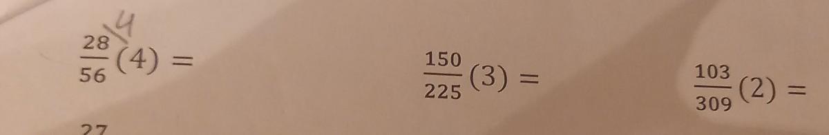 \frac{28}{56}   =  \frac{1}{2}  \\  \frac{150 }{225 }  =  \frac{2}{3}  \\  \frac{103}{309}  =  \frac{1}{3}