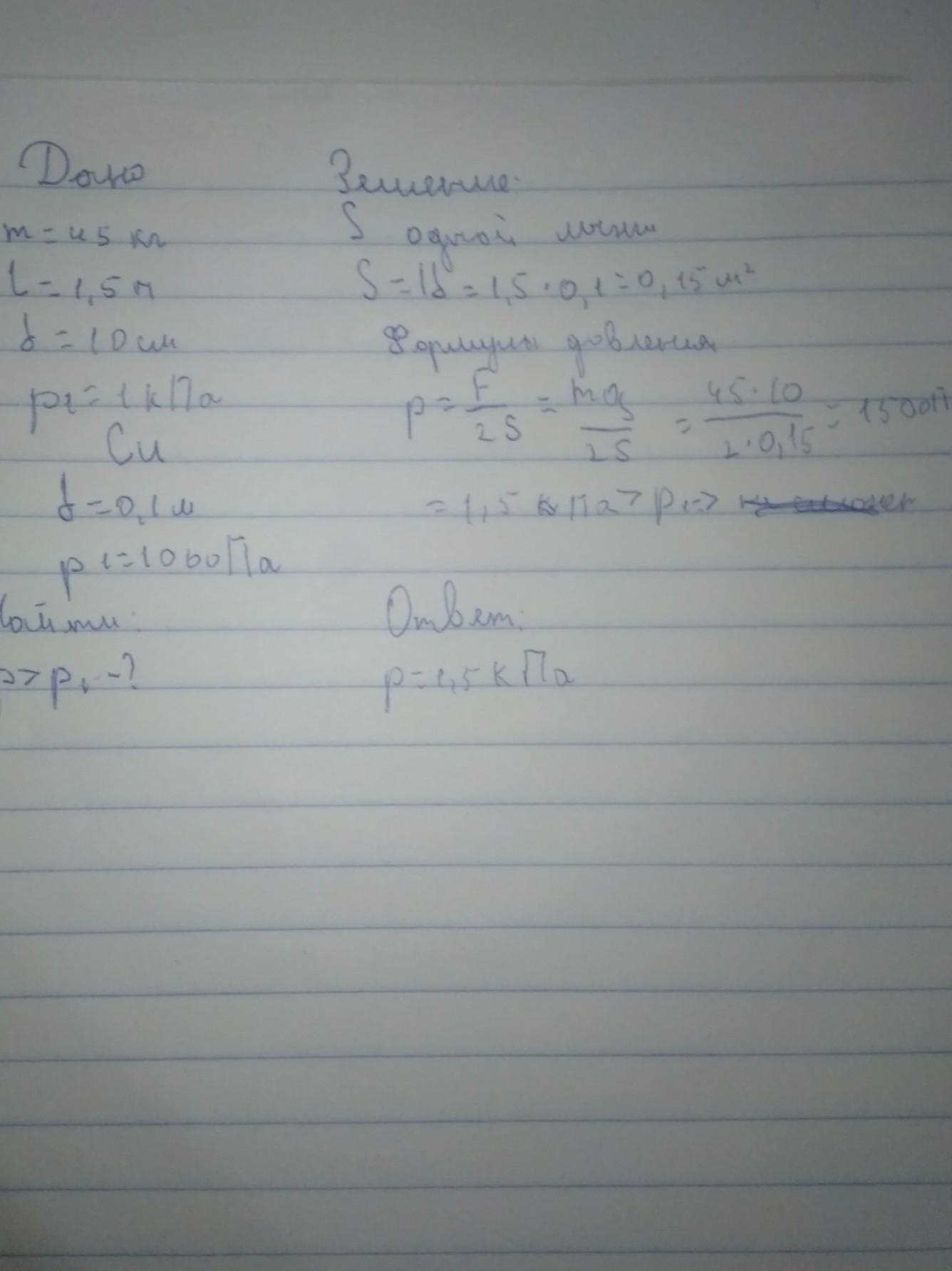 Принимая длину одной лыжи равной 1,2м и ширину - 10см, определите давление, которое оказывает мальчик массой 45кг на снег!!!!!